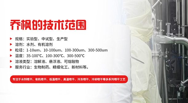 上海喬楓實業有限公司,成立于2012年,是從事噴霧干燥設備的研發設計、生產、銷售(小型噴霧干燥機實驗型噴霧干燥機,35℃低溫噴霧干燥機,有機溶劑噴霧干燥機低溫閉式循環噴霧干燥機、超細粉末噴霧干燥機、噴霧冷凍干燥機真空噴霧干燥機、氣流噴霧干燥機,噴霧造粒干燥機,離心噴霧干燥機沸騰制粒機等)和售后于一體的綜合性公司,本公司現成為一家致力于為生物制藥、精細化工、新能源、陶瓷造粒及食品工程等領域提供全套解決方案的整線交鑰匙工程企業。